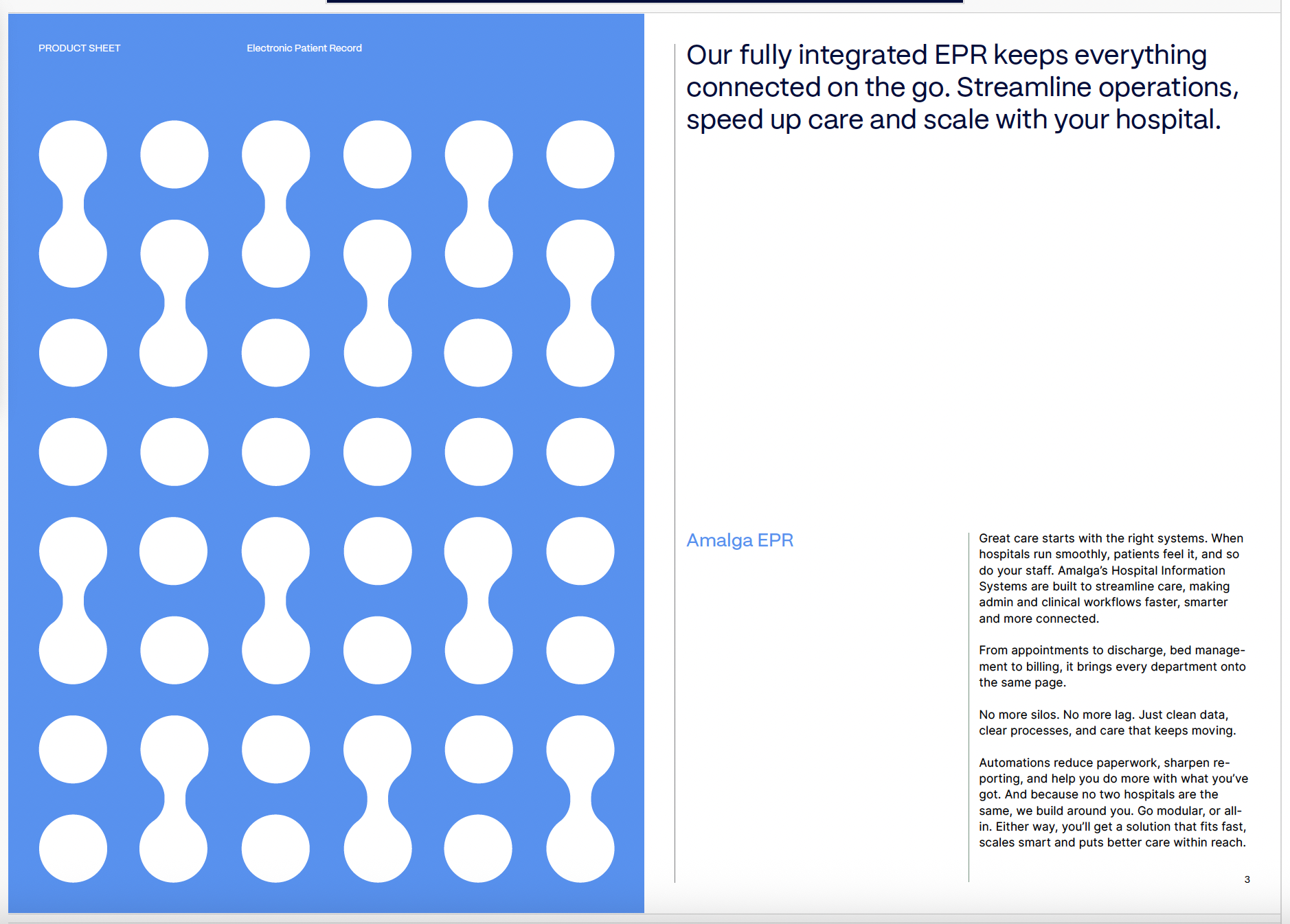 This included: developing the rebrand positioning and story, launching www.amalga.health, working with CEO Niru Rajakumar to leverage his LinkedIn page and launch the Amalga LinkedIn page, writing thought leadership articles, rewriting all content (website, product sheets, display ads, PR releases, product information, sales enablement, LinkedIn posts & articles, merchandise).